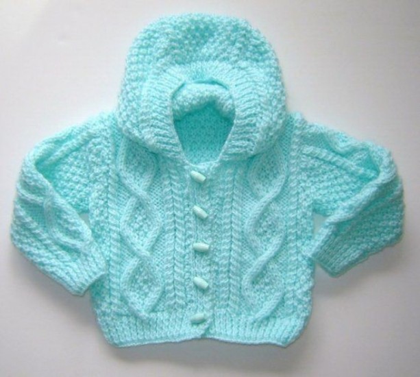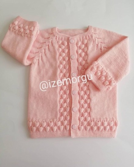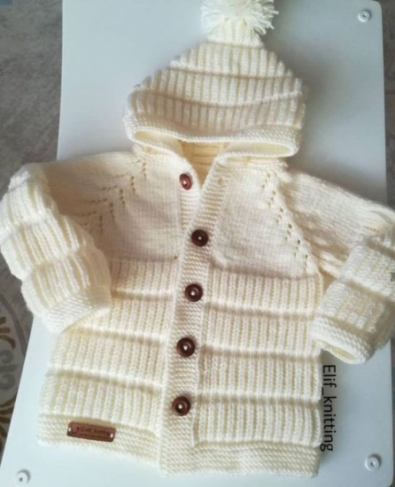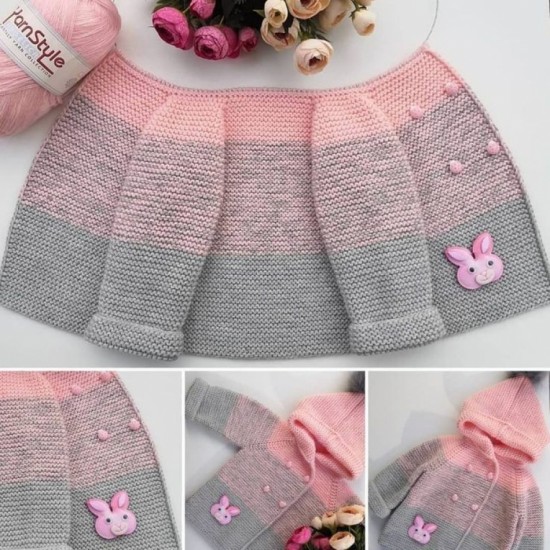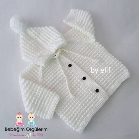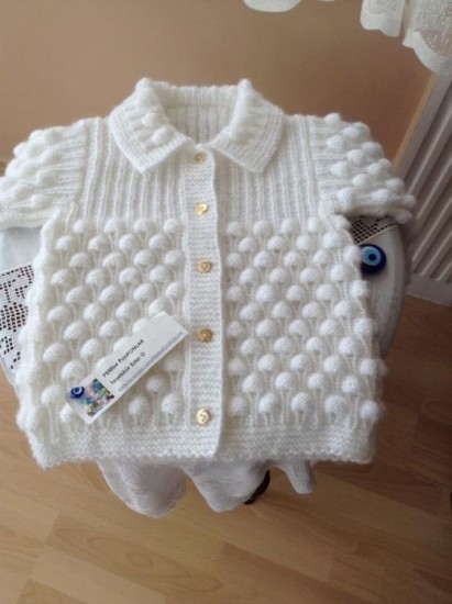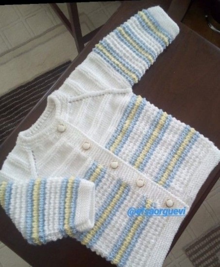 35 stitches are started. 5 cm 1 + 1 rubber is knitted and continued with a plain weave. When the length of the body is 17 cm, 3 + 2 + 1 loops are cut for the arm of the house.