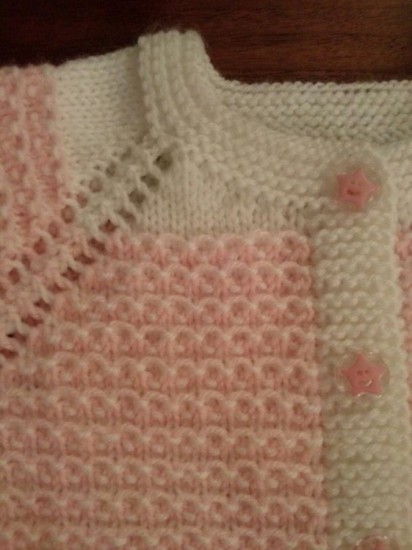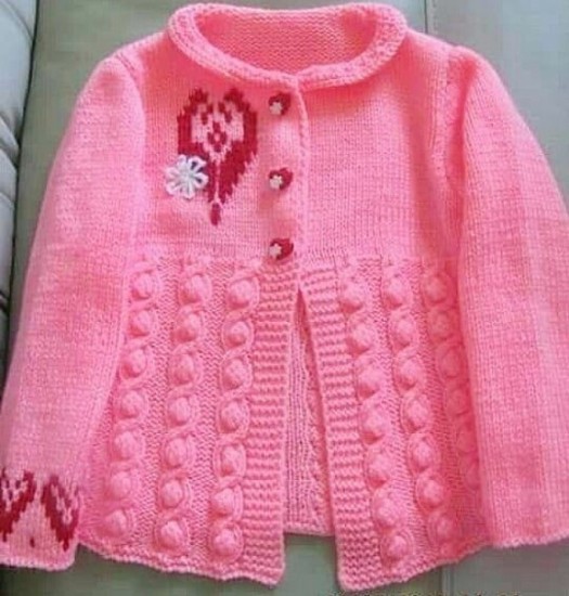 Weaving another 8 cm, 5 + 3 + 2 + 2 + 1 stitches are cut for the neck and immediately cut off and the loops left on the shoulder are finished. The other half of the front body is knitted in the same way.