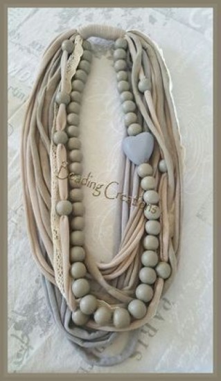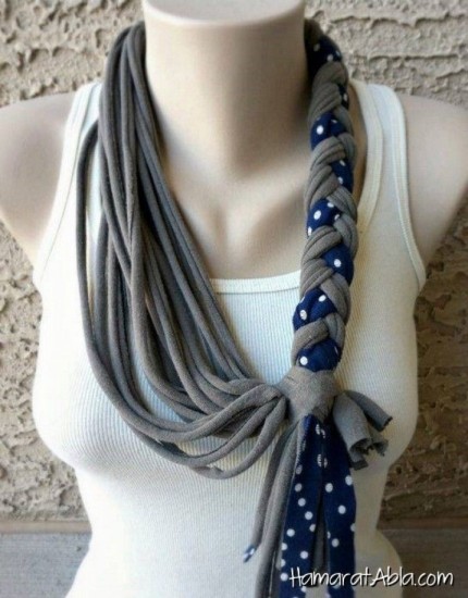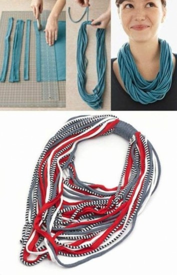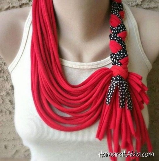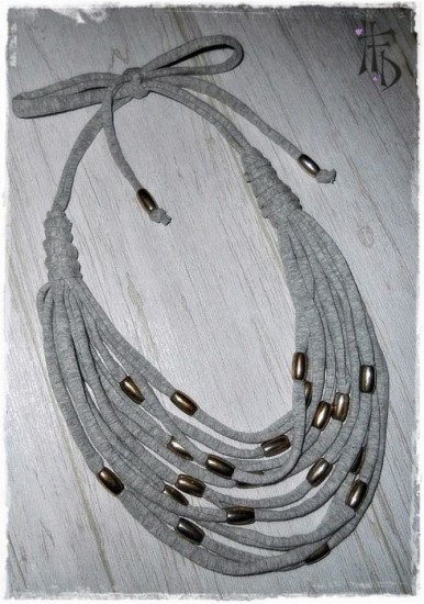 Fold the pieces cut from the shirt inwards and stretch them. Set the beads in the middle and knot as many times as you like in the middle