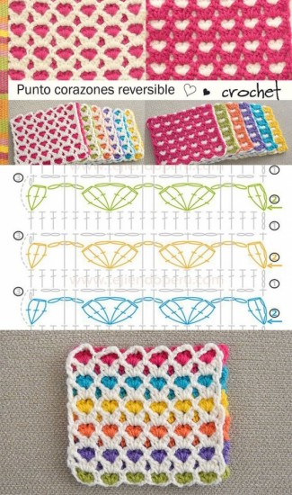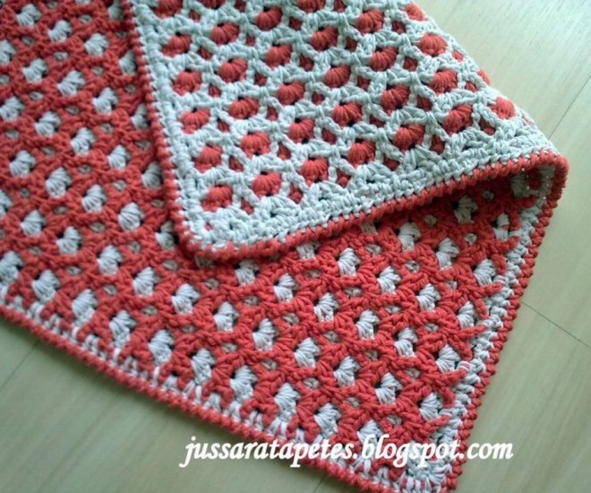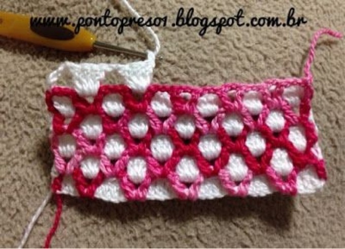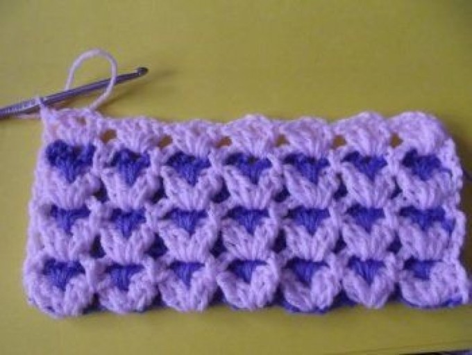 Notice, when we complete each row, we dip our crochet in the bottom row and chain a 5-chain row from there with the rope of the other color and continue to include the other during the second turn, so we include both colors.