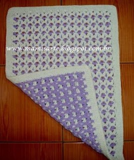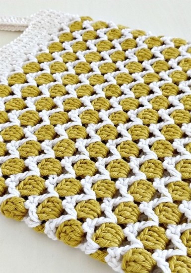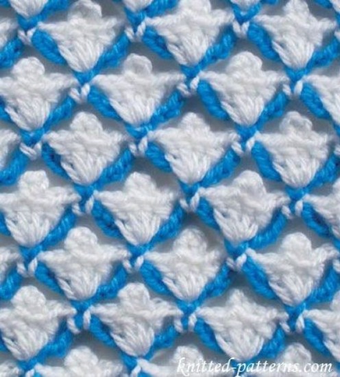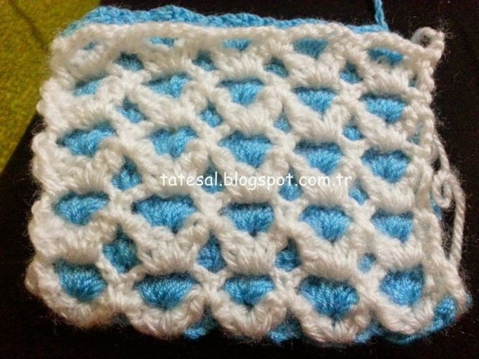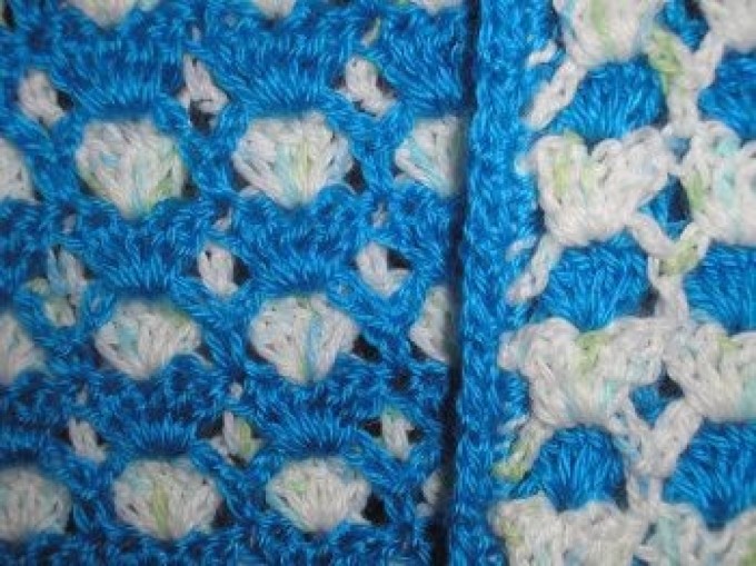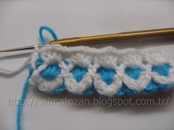 When the white row is finished, we go back to the blue rope and make a chain of 5 chains from the bottom row.