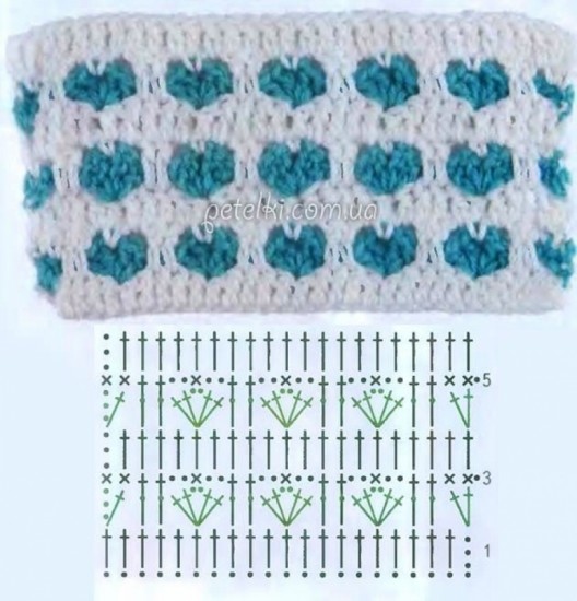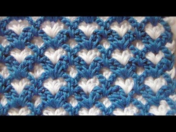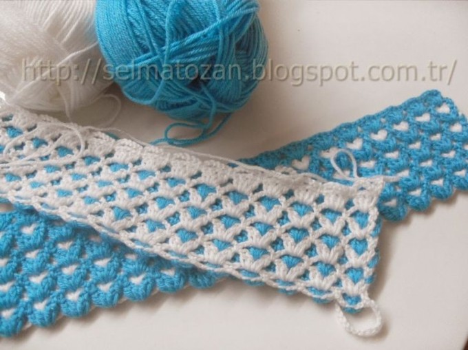 Including the chain of rows that we knit in the 1st and 2nd rows, we continue with the blue yarn, we take it right in the middle of the white handrails.