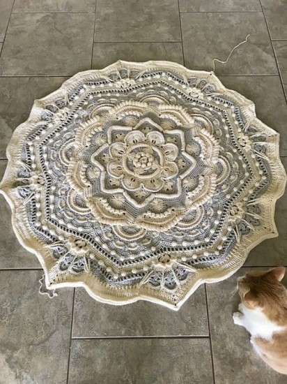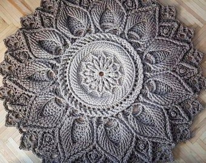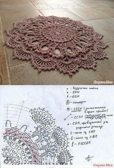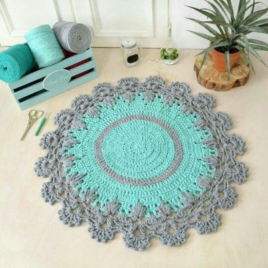 The truth is that it is a material that is a pleasure to work with, you see how the carpet grows with each turn by leaps and bounds. In fact, I started with a pattern that was too open for a T-shirt bath mat (as seen in the photos) so I undid it completely without further ado and started over. Finally, I was improvising on the fly, alternating double crochets or double crochets with Puff Stitch (you can find demonstration videos of each type of stitch clicked on the colored letters). This is how the pattern was.